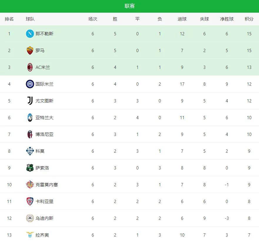 随着米兰与尤文图斯的平局,那不勒斯和罗马成为本轮比赛中的最大赢家。目前意甲积分榜排名如下: