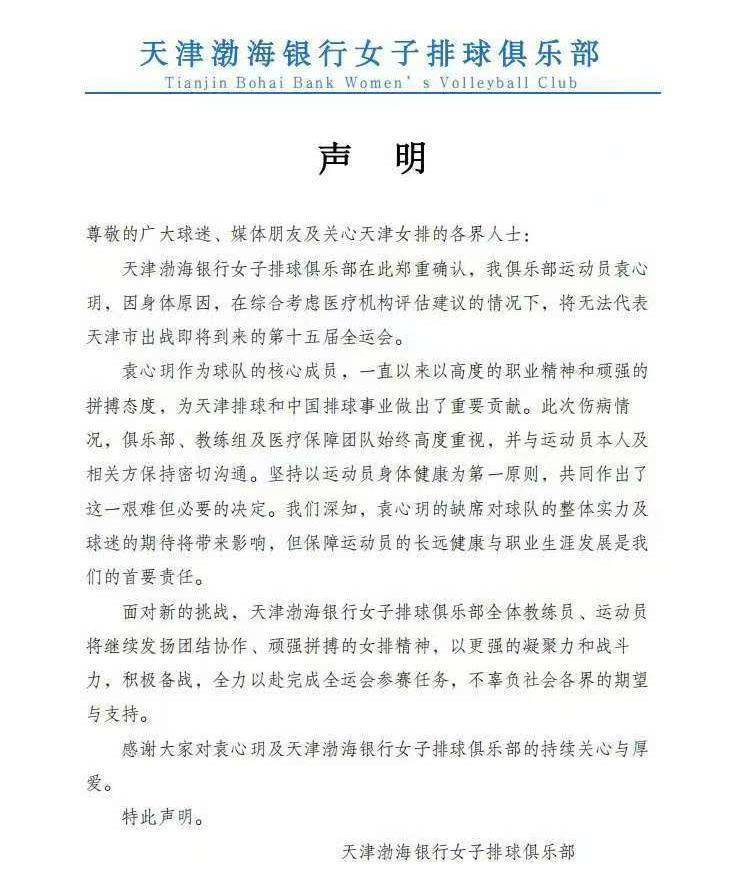 天津渤海银行女排俱乐部发布声明称,袁心玥因伤病原因将缺席第十五届全运会。