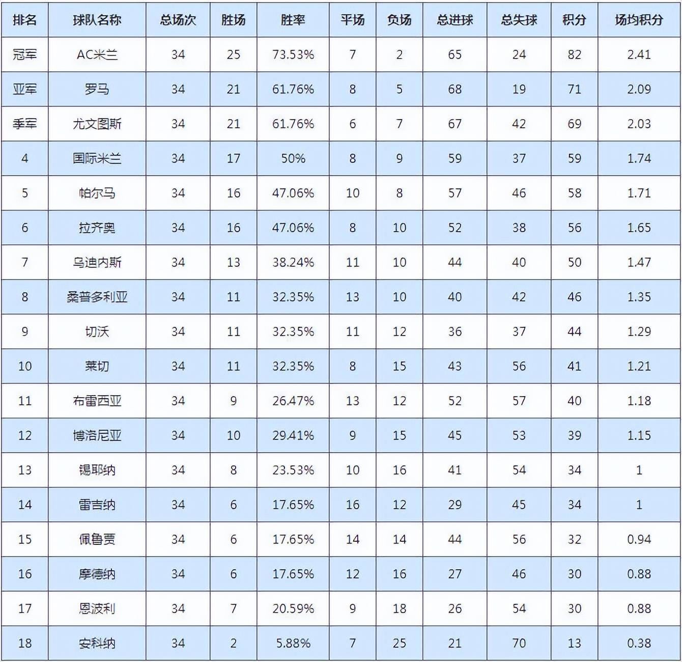 收官阶段,AC米兰继续强势表现,主场1比0小胜红狼罗马后,提前2轮夺得队史第17个意甲联赛冠军,整个赛季25胜7平2负,积分达到82分,领先第二名罗马11分,领先第三名尤文13分,领先第四名国际米兰23分!以巨大优势夺冠。进球65个,失球24个。舍瓦打入24球,第二次荣膺意甲最佳射手。