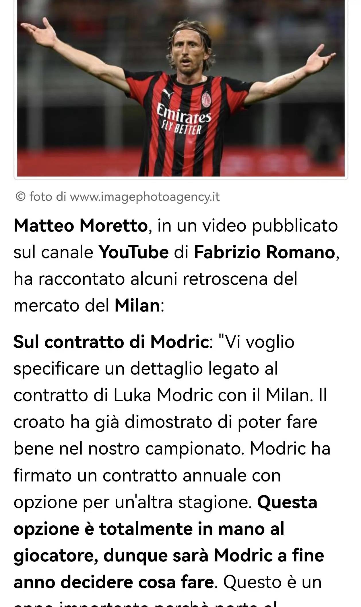 “我想具体说明一下卢卡·莫德里奇与米兰合同中的一个细节。这位克罗地亚球员已经证明自己能很好地适应意甲联赛。莫德里奇与球队签署了一份为期一年的合同,同时包含延长一个赛季的选项。