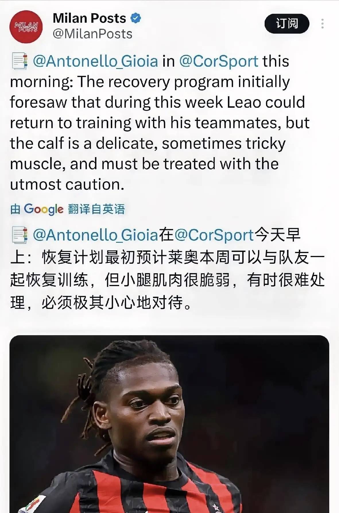 今天莱奥的小腿依然存在疼痛问题,他无法完成与球队的合练,米兰队医的评估并不乐观,莱奥的情况可能比想象的糟糕,他很可能会在缺席博洛尼亚后继续缺席米兰与乌迪内斯比赛。大概是几天前公布莱奥的伤病不是单纯的腿部受伤,而是比目鱼肌撕裂,当时我还调侃米兰队医水平问题,但今天有老哥说如果是比目鱼肌撕裂休息时间肯定要超过一个月,莱奥复出时间肯定是在九月下旬,现在队医说低于预期,估计是之前治疗方向可能有问题,毕竟莱奥是伤了半个月后咱们队医才弄明白莱奥是啥问题,但半个月时间莱奥并没有接受专业的治疗。