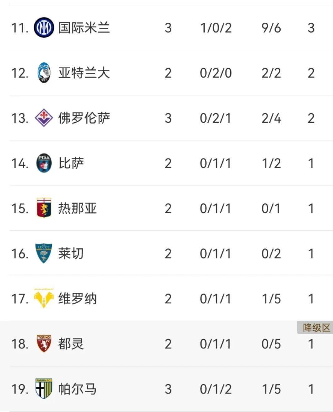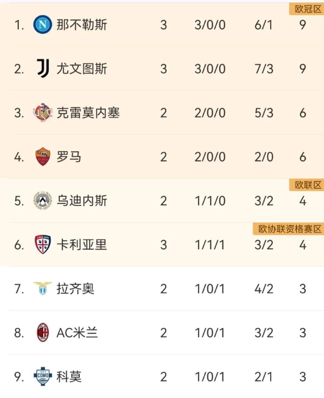积分榜形势因这一夜的结果彻底清晰。 那不勒斯与尤文图斯同积9分,但因净胜球优势( 5)力压尤文( 4)位居榜首。 黑马克雷莫纳和罗马均两战全胜积6分,紧随其后。 而国际米兰则因连续两轮失利,仅积3分排名第七,防守端三场丢6球的问题暴露无遗。 佛罗伦萨同样开局不佳,三轮仅积2分,位列联赛中下游。