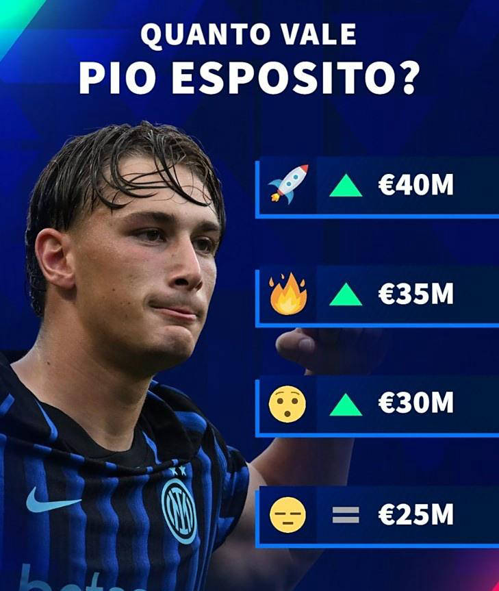 转会市场数据显示,下个月德转将更新意甲球员的身价,其中国米20岁前锋埃斯波西托的身价预计将大幅上升。目前他的身价为2500万欧元,而即将发布的最新数据可能显示为2500万欧元、3000万欧元、3500万欧元以及4000万欧元等多个档次的提升。