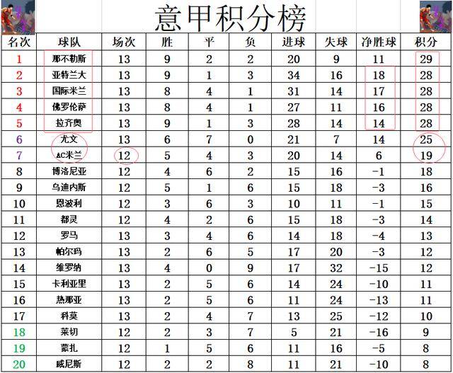 积分榜方面,今天拉齐奥,那不勒斯和佛罗伦萨都赢了球,这样的线分,这样的话他们的分差依然不变,那不勒斯1分优势重回榜首,亚特兰大净胜球优势排在第2,国米本轮比佛罗伦萨多刷了2个净胜球,他们也就以一个净胜球优势排在第3,佛罗伦萨第4,拉齐奥第5。平局王,唯一保持不败的尤文又跌回到第6的位置,被前5拉大了分差。