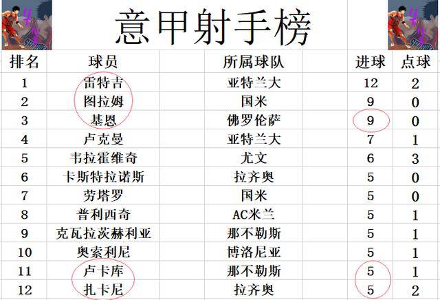 射手榜方面,雷特吉12球领跑,基恩今天打入一球后追上图拉姆,两人9球并列第2,卢克曼7球排第4。卢卡库和扎卡尼今天破门后追上劳塔罗,普利西奇,克瓦拉茨赫利亚等人5球刚好挤入前十。返回搜狐,查看更多