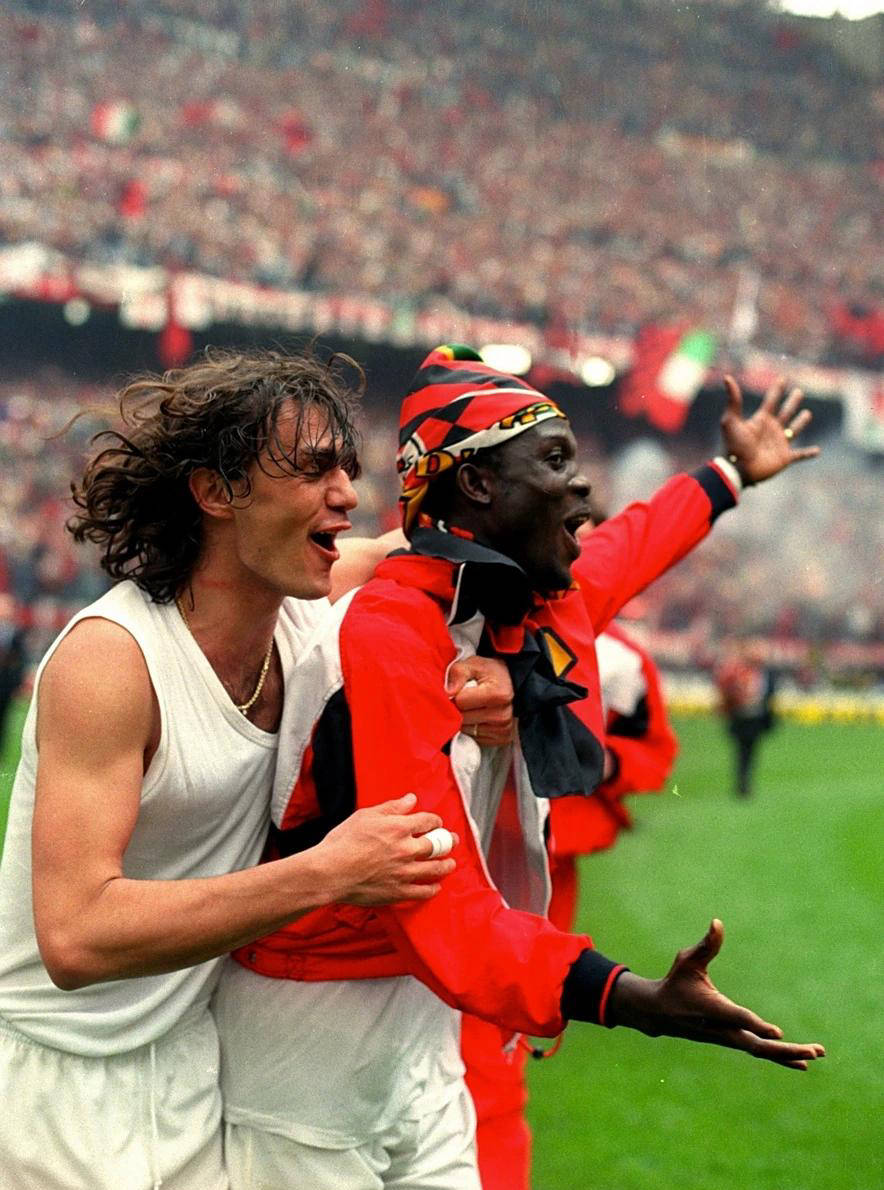 1996年4月28日,意甲联赛第32轮,AC米兰主场3比1战胜佛罗伦萨紫百合队,提前两轮夺得队史第15座意甲联赛冠军,马尔蒂尼与利比里亚球星维阿(从CCTV5升级到CCTV1)共同庆祝。