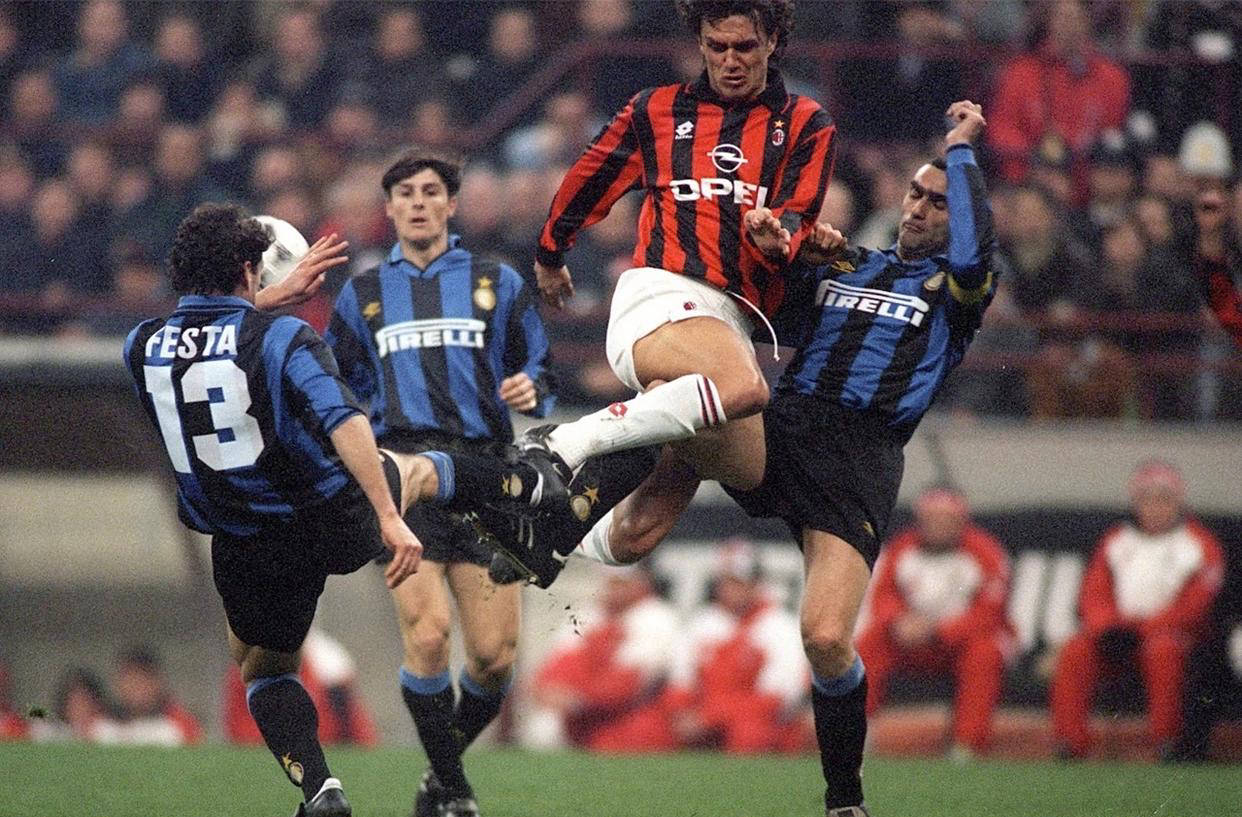 1995年10月29日,意甲联赛第8轮上演了米兰德比,AC米兰客场1比1战平来自同城的对手国际米兰,马尔蒂尼与费斯塔和国际米兰队长贝尔戈米搏斗,远处是阿根廷年轻球员萨内蒂。