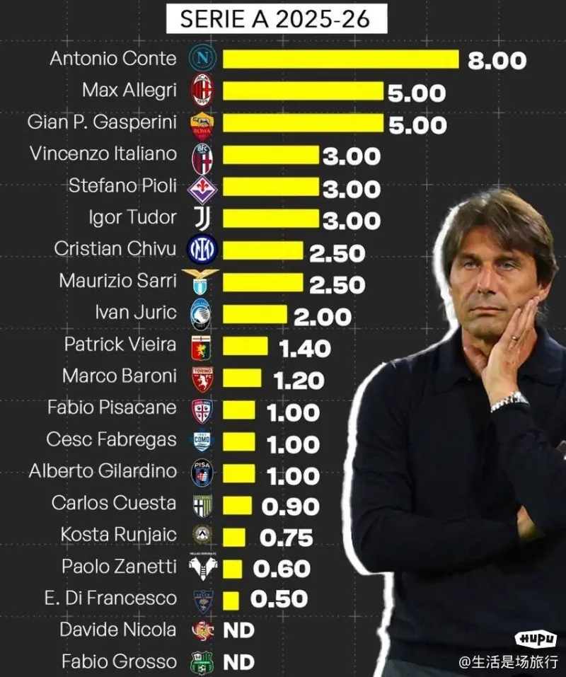 意甲直播,意甲赛程,意甲积分榜,尤文图斯直播,意甲比分预测/面向中文球迷的意甲资讯平台,涵盖2025赛季完整赛程、免费高清直播入口、积分榜更新与竞彩波胆预测,聚焦尤文、国米、米兰三大豪门赛事。08月06日讯 近日,意大利金融媒体Calcio e Finanza统计了25-26赛季意甲各队主帅的年薪排行。