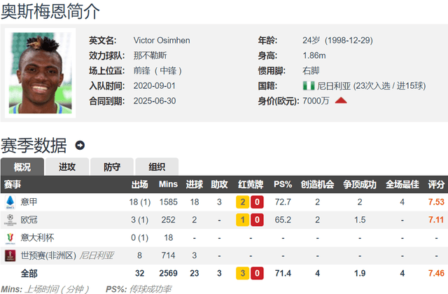 据数据统计,现年24岁的奥斯梅恩各项赛事已经连续6场比赛取得进球,本赛季各项赛事24场20球3助攻,其中意甲19场18球3助,欧冠4场2球。由于奥斯梅恩的出色发挥,那不勒斯在意甲已经取得15分的争冠优势,可以说本赛季联赛夺冠只是时间上的问题;欧冠也半只脚跨入了八强。奥斯梅恩出色的发挥已经引起了多家豪门的关注,其中缺乏中锋的曼联、阿森纳、拜仁、皇马均渴望夏窗引进奥斯梅恩。