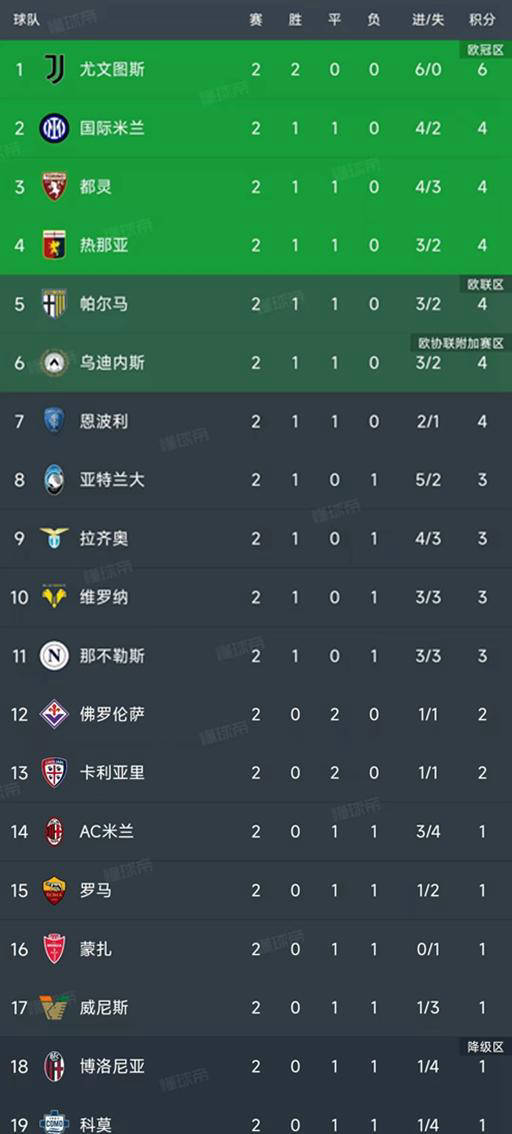 意甲直播,意甲赛程,意甲积分榜,尤文图斯直播,意甲比分预测/面向中文球迷的意甲资讯平台,涵盖2025赛季完整赛程、免费高清直播入口、积分榜更新与竞彩波胆预测,聚焦尤文、国米、米兰三大豪门赛事。北京时间8月27日,意甲第二轮比赛全部落下帷幕。让我们一起来看看最新的积分榜情况,目前唯一一支全胜的球队尤文图斯领跑积分榜。