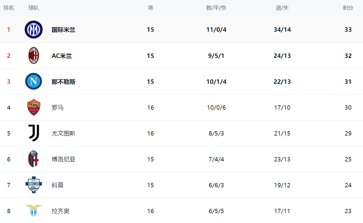 在积分榜上,国际米兰排名榜首。国际米兰11胜4负,拿到33分。排名第2的是AC米兰。AC米兰9胜5平1负,拿到32分,只比国际米兰少1分。第3名的是那不勒斯,拿到31分。输球的罗马依然是30分,排名第4。尤文图斯赢球之后,总积分达到29分,排名第5,只比罗马少1分,下一轮有可能杀入欧冠区。博洛尼亚以25分排名第6。法布雷加斯率领的科莫以24分排名第7。拉齐奥23分排名第8。返回搜狐,查看更多