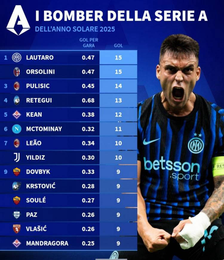 紧接着,德转发布了2025赛季意甲射手榜数据,前锋劳塔罗以15粒进球与奥尔索里尼并列榜首。排名第三的是14球的普利西奇,紧随其后的还有13球的雷特吉和12球的基恩。劳塔罗在本赛季依然保持着极强的破门效率,证明了他在联赛中的稳定表现。